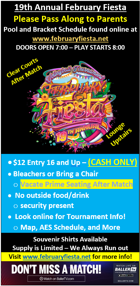 February Fiesta souvenir shirts and other volleyball attire will be available for purchase.